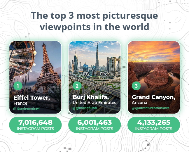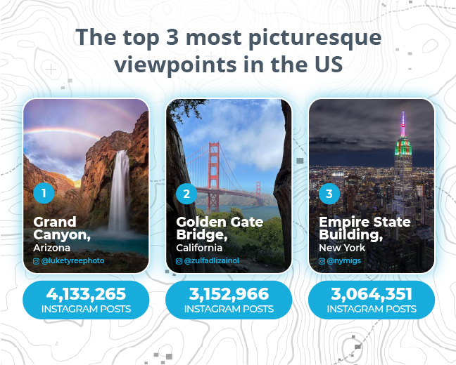 We wanted to find the most picturesque viewing points in the world and throughout the US, so we used lists from Cheapism, Insider, LoveExploring, FarandWide, and Insider.