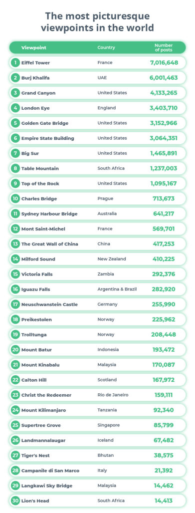 The Eiffel Tower is one of the most iconic landmarks on the Parisian skyline, offering unparalleled views of the world’s most romantic city. Accessible via a glass lift, the top of the tower is 276 meters off the ground and the views of Paris are unrivaled. Perhaps it’s no surprise to see that the Eiffel Tower comes in first place as the most picturesque viewpoint, with 7,016,648 tagged posts.